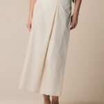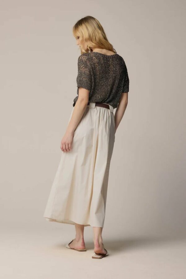 La gonna lunga presenta un taglio svasato sottolineato dalla piega centrale, il punto vita è rifinito dalla cintura con fibbia in metallo.