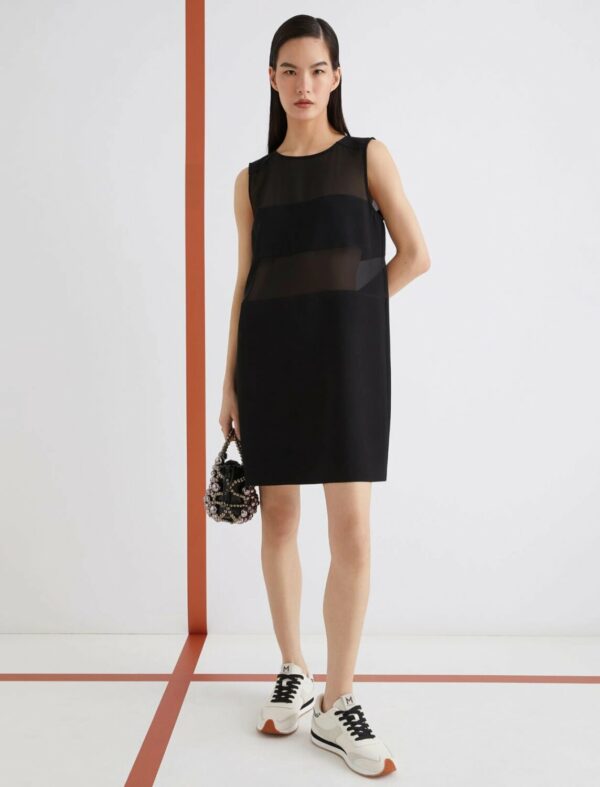 Essenziale nelle linee, sofisticato nei materiali: nuovo abito smanicato in envers satin, con pannelli orizzontali in georgette che creano un gioco sensuale di trasparenze sul busto.