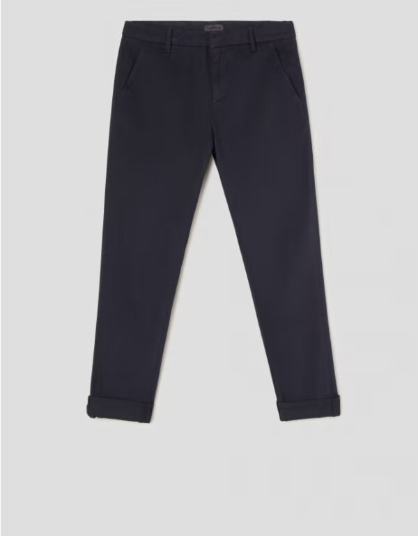 Pantalone Gaubert slim chino, vita bassa, tasche a filetto posteriori. Gabardina stretch mano calda. Tintura in capo. Logo Dondup. Made in Italy