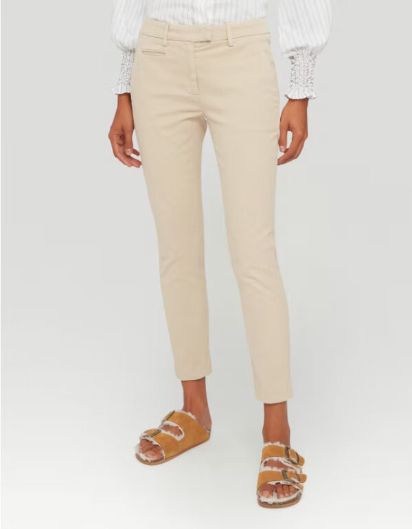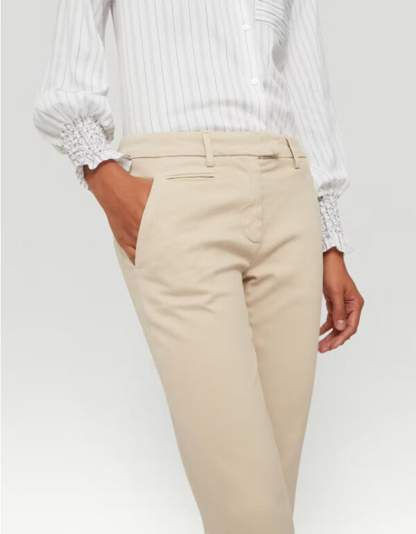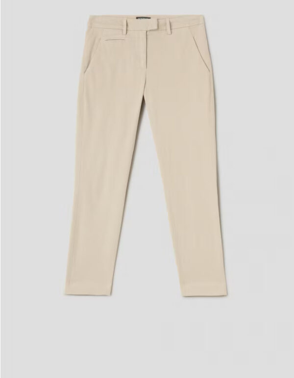 Pantalone Perfect cropped slim chino, vita regolare, tasche a filetto posteriori. Gabardina stretch mano calda. Tintura in capo. Logo Dondup. Made in Italy