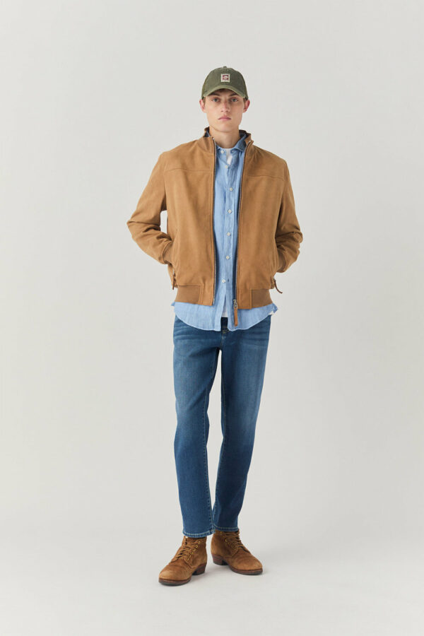 Jeans in denim con lavaggio scuro e leggere baffature sul fronte.