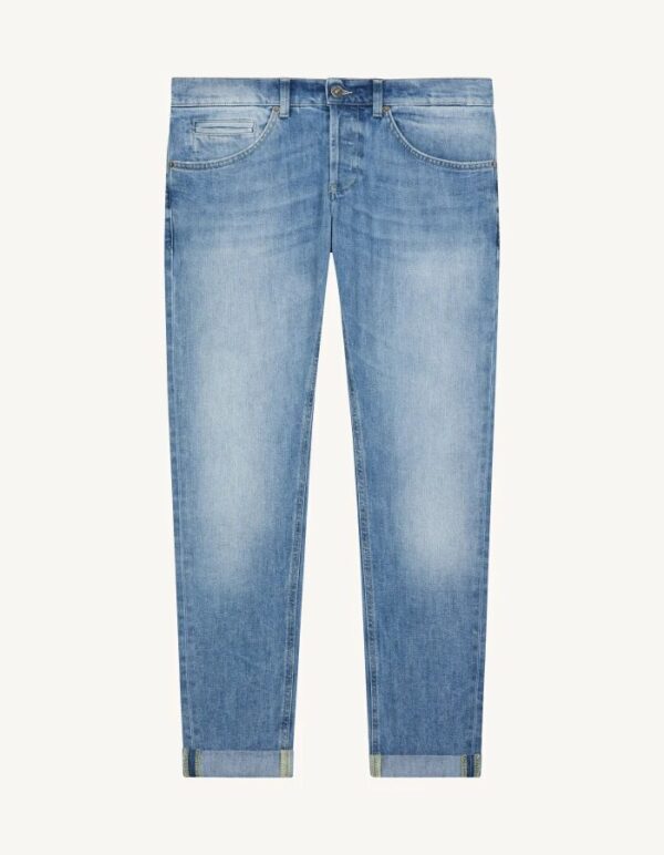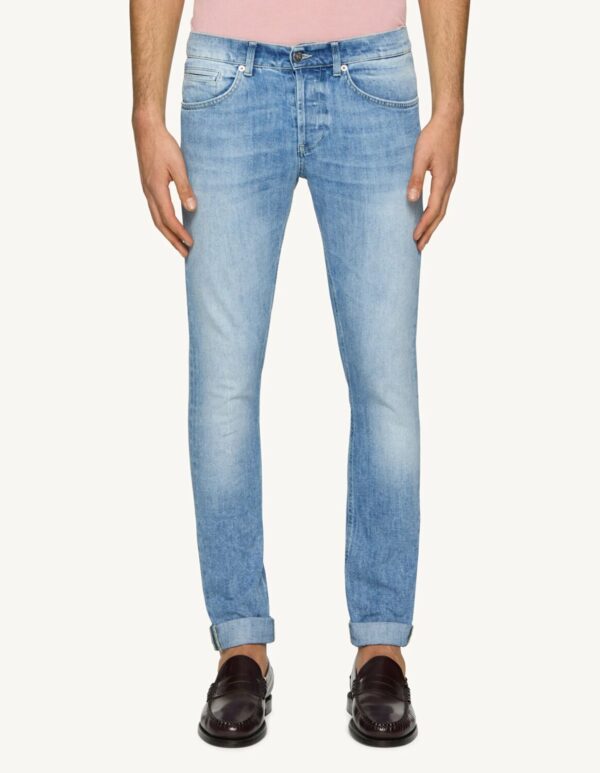 Jeans George cinque tasche skinny fit, vita bassa, taschino a filetto. Denim stretch blu 11 oz. Lavaggio chiaro pulito. Logo Dondup. Made in Italy