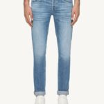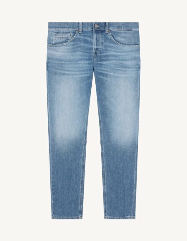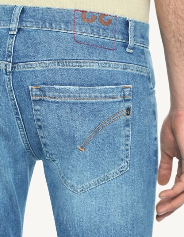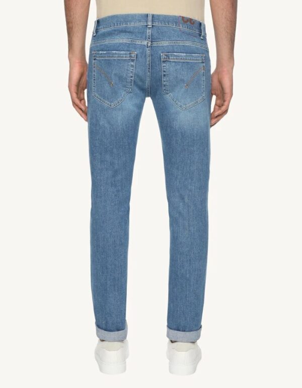 Jeans George cinque tasche skinny fit, vita bassa, taschino a filetto. Denim stretch bluesign APPROVED blu 11.50 oz. Lavaggio chiaro pulito. Logo Dondup. Made in Italy