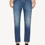 Jeans Mius cinque tasche slim fit, vita bassa, lunghezza 30 inches. Denim stretch leggero blu 9 1/4 oz. Lavaggio medio pulito. Logo Dondup. Made in Italy