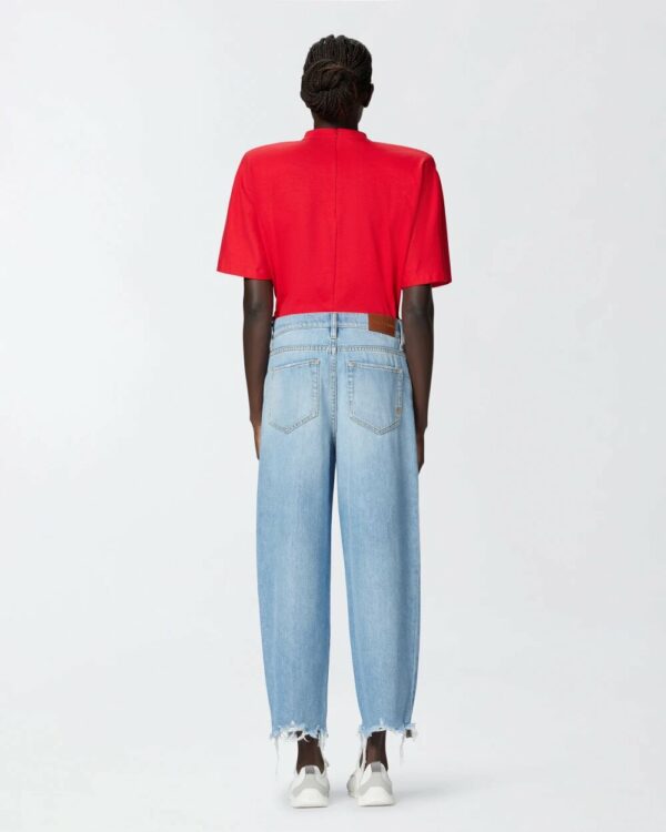 Jeans cinque tasche da donna dalla silhouette egg-fit realizzati in denim soft touch di misto cotone e lyocell dal lavaggio light wash, che dona al capo una tonalità chiara e contemporanea. La linea ampia e arrotondata della gamba di questi jeans è completata da fondo capo con orlo sfrangiato e irregolare, con rotture create ad hoc per un effetto vissuto. Vita regular con cavallo leggermente sceso, chiusura con zip e bottone a chiodo in metallo. La vestibilità di questi jeans balloon è estremamente di tendenza per questa stagione, ed è protagonista dei look quotidiani più cool.