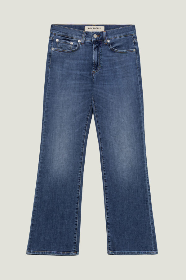 Jeans di ispirazione anni 70 in denim con lavaggio medio. Vita alta con passanti e salpa applicata sul retro. Due tasche sul fronte e due tasche sul retro con label Roy Roger's applicato. Chiusura con bottone logato e zip. Boottcut fit. COMPOSIZIONE: 98% COTONE 2% ELASTODIENE.