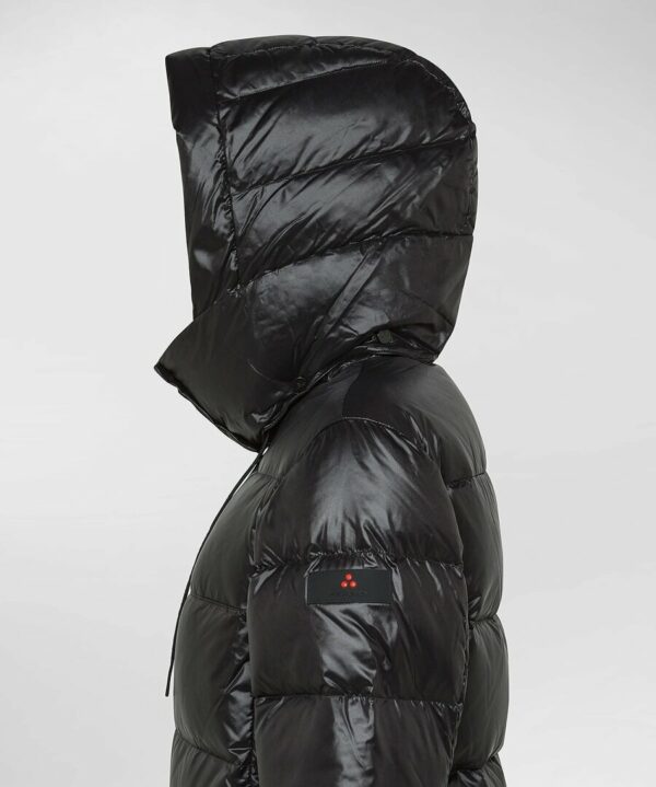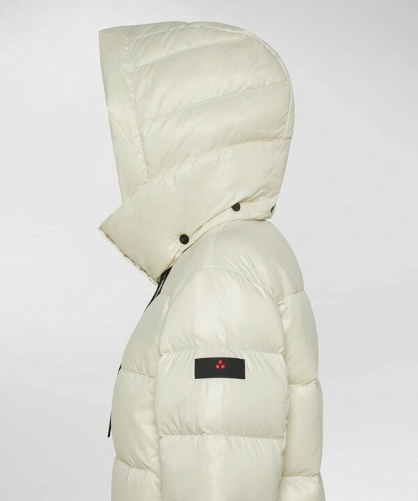 Puffer jacket ad ampie trapunte dal volume moderno, realizzato in nylon lucido dalla particolare morbidezza grazie a degli speciali trattamenti subiti. Limbottitura diretta in piuma naturale certificata garantisce calore e leggerezza, mentre il doppio cappuccio uno interno fisso e uno esterno removibile offre massima protezione e adattabilità. Il collo alto con bottoni a pressione, la full zip centrale a doppio cursore a vista, in contrasto colore nero, e le ampie tasche laterali completano un capo pratico e distintivo, perfetto per uno stile urbano con attitudine outdoor. l tessuto è trattato con finitura idrorepellente.