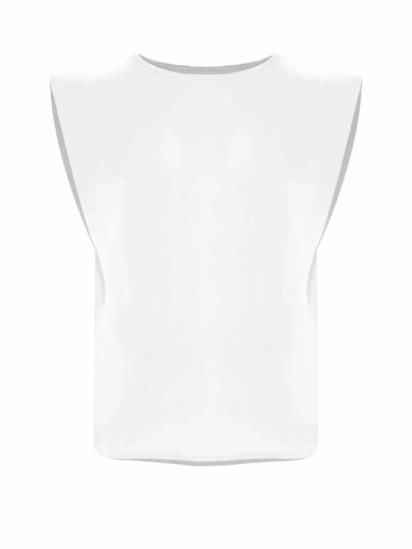 La raffinatezza della blusa smanicata è sottolineata dal tessuto effetto lucido, dal fit scivolato e dallo scollo rotondo. Chiusura con bottone sul retro.