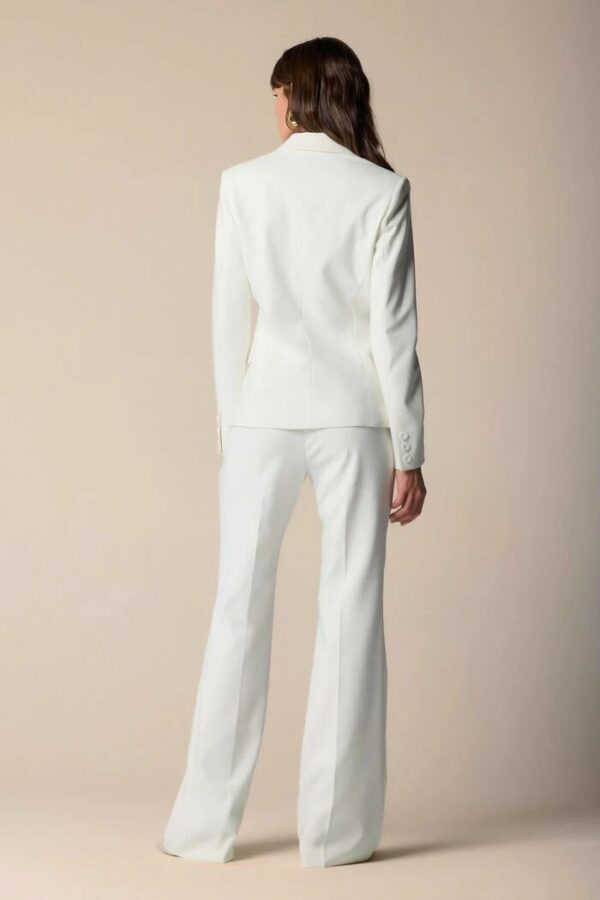 Elegante tailleur composto da giacca doppiopetto con collo a revers e tasche con pattina e pantalone dritto con vestibilità aderente.