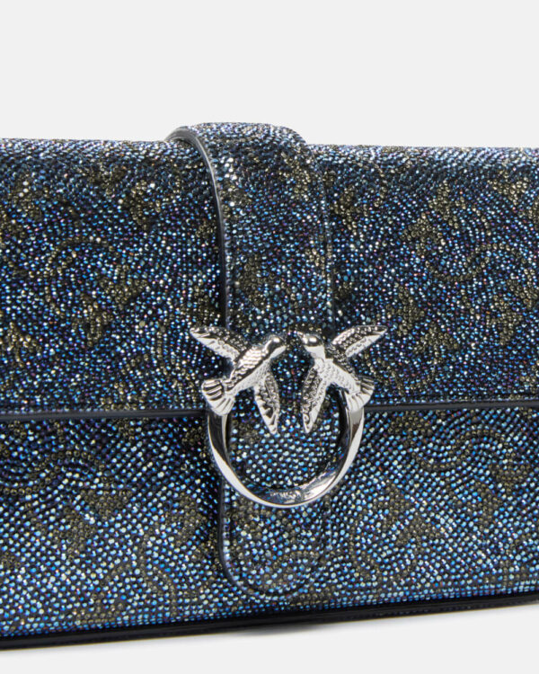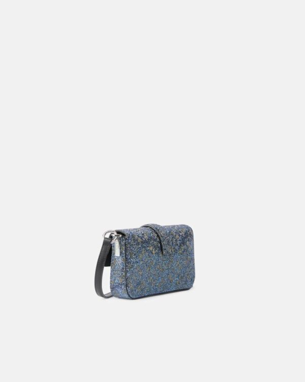 Sofisticata baby bag dalla linea slouchy completamente ricoperta di strass che creano il motivo monogram iconico dall'effetto scintillante e glamour. La superficie tempestata cattura la luce conferendo luminosità e carattere prezioso all'accessorio, mentre la struttura compatta con patta frontale e chiusura magnetica garantisce praticità d'uso quotidiano. Il logo metallico impreziosisce la chiusura frontale completando il design luxury, abbinato a catena metallica e tracolla in pelle per versatilità di portabilità. I cristalli applicati formano un pattern all-over che dona raffinatezza e distintività, trasformando l'accessorio in un vero statement piece dal forte impatto visivo. Perfetta per illuminare outfit serali o aggiungere glamour a look casual, si abbina splendidamente a capi tinta unita per esaltare l'effetto scintillante.