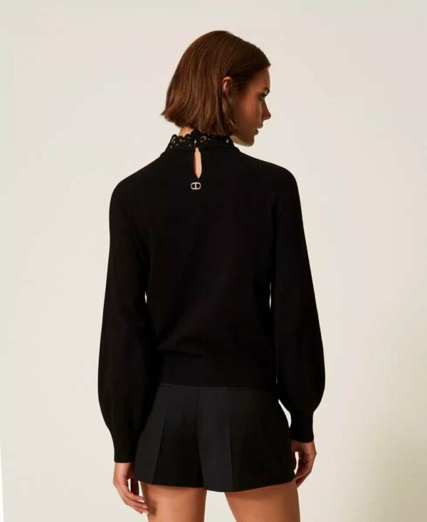 Maglia lupetto in misto viscosa con lavorazione rasata e applicazione di passamaneria in pizzo che rifinisce il collo. Ha maniche lunghe morbide, apertura a goccia con bottoni sul retro, linea morbida.