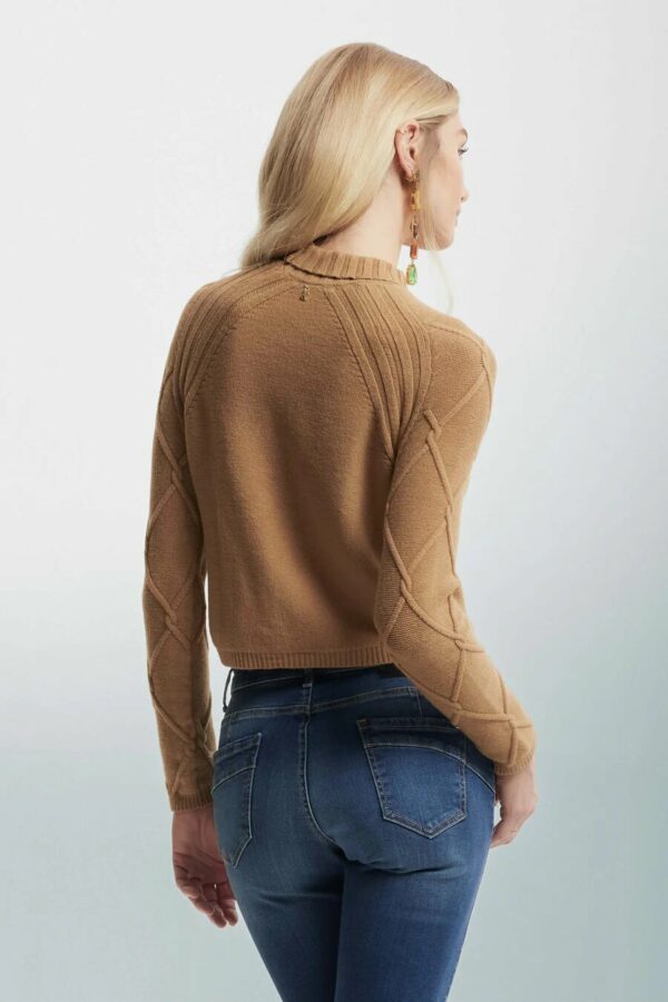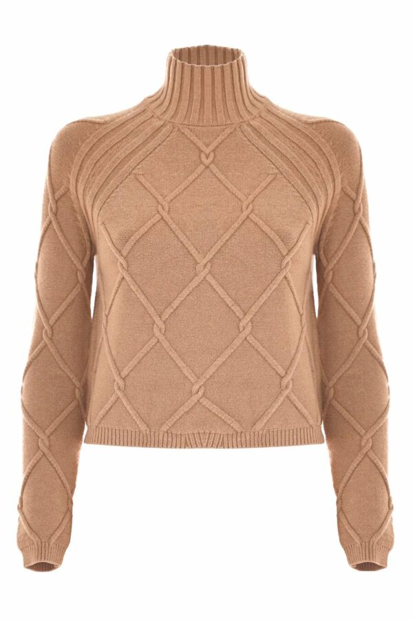 Elegante maglione a collo alto da donna in misto viscosa. Raffinato design a trecce con motivo a rombi 3D.