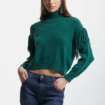 Maglione a collo alto da donna in misto viscosa. Questo capo è rifinito con frange sulle maniche.