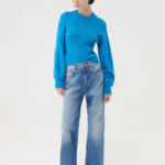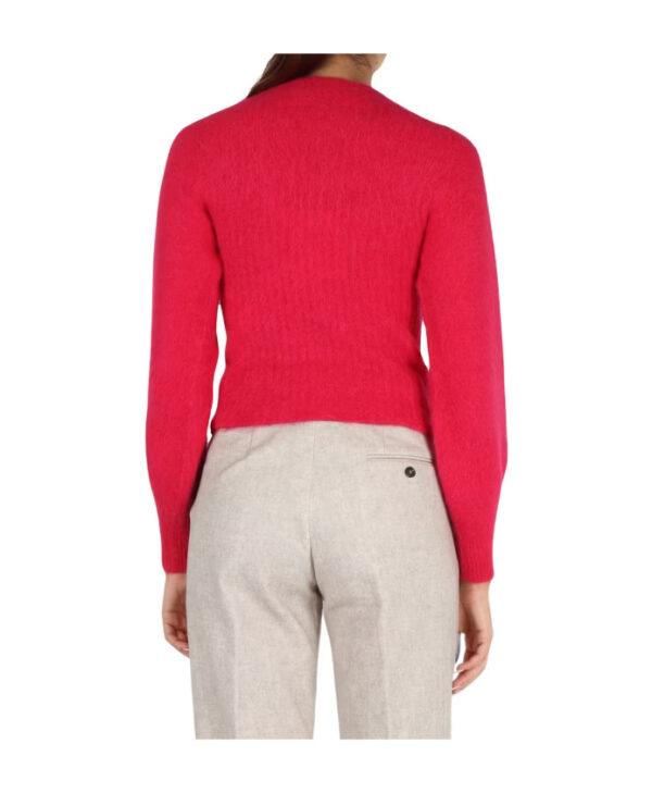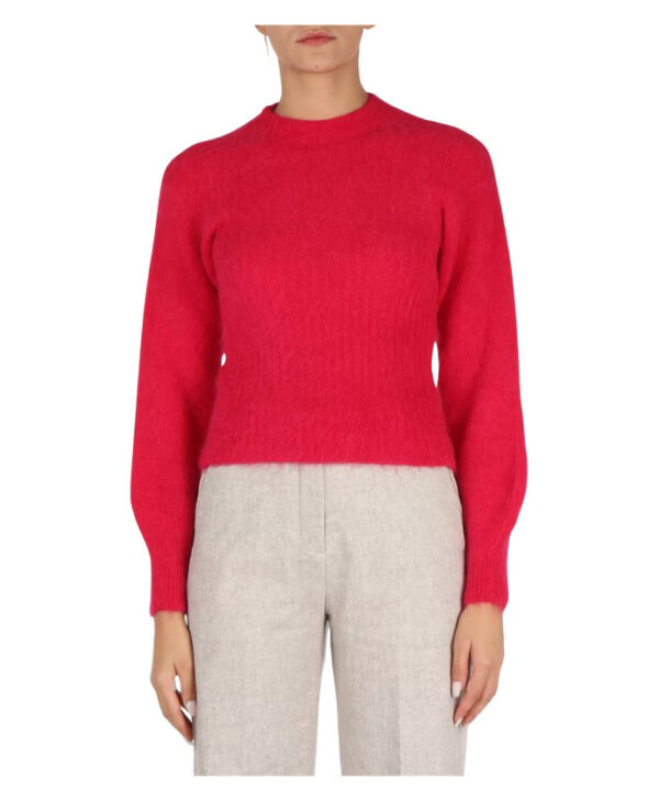 Maglia in misto alpaca, linea dritta con fronte e retro a coste. Collo alto, maniche ampie con polsino a coste.