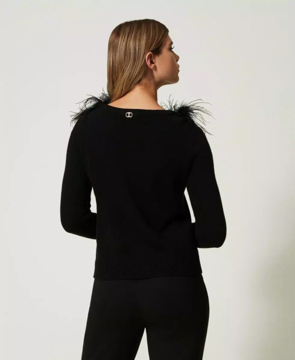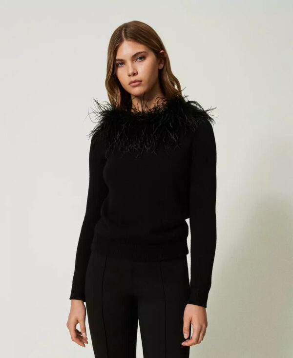 Aggiungi personalità ai tuoi look speciali con la maglia in misto lana rasata con collo arricchito da bordo di piume con bottoni da agganciare ad asole elastiche volanti. Ha maniche lunghe a guanto con polsi a costine, collo a barchetta, linea fitted. Abbinala a minigonna e scarpe platform per un look che non passerà inosservato.