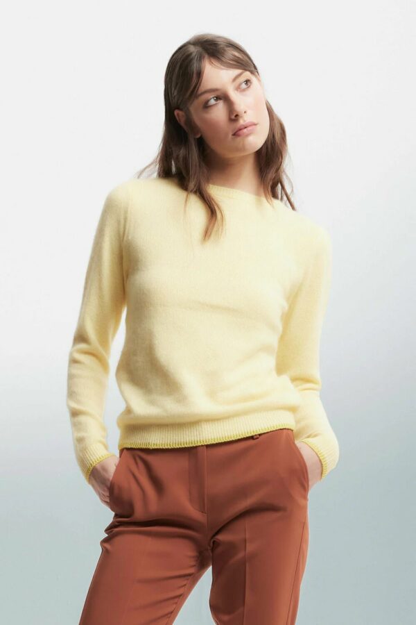 Maglione minimalista da donna realizzato in misto lana e angora, rifinito con bordo a coste su orlo e polsini.