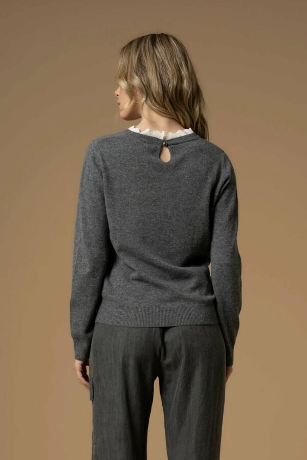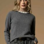 Lo stile classico e intramontabile di questa maglia è caratterizzato da un delicato ricamo in pizzo sangallo che impreziosisce lo scollo rotondo del capo. Il modello presenta taglio dritto, vestibilità regolare e bordi a costine.