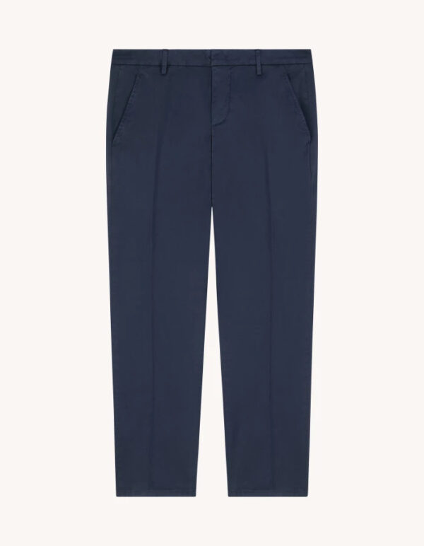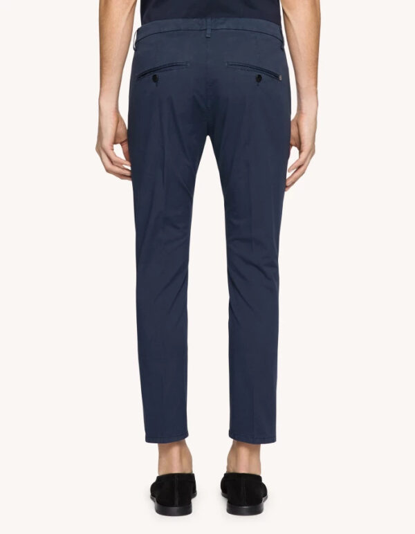 Pantaloni Alfredo slim chino, vita bassa, tasche a filetto posteriori, lunghezza 28 inches. Gabardina leggera. Tintura in capo. Logo Dondup. Made in Italy