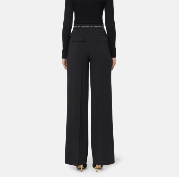 Pantaloni in crêpe leggero dalla vestibilità regular con linea a palazzo. Il dettaglio di stile è il nastro in vita ispirato alla sartoria maschile posizionato esternamente al capo, con logo a contrasto. Tasche alla francese e patte applicate sul retro.