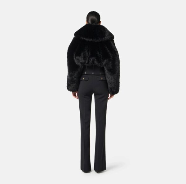 Pantaloni in crêpe leggero dalla vestibilità aderente e con gamba leggermente svasata alla caviglia. Si distinguono per la cintura che impreziosisce il punto vita, realizzata in catena con logo e nappina pendente. Sul retro, patte applicate con bottoni smaltati e pattern di ispirazione snake.