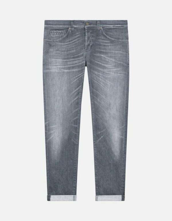 Jeans George cinque tasche skinny fit, vita bassa, taschino a filetto. Denim power stretch grigio 11 oz. Lavaggio grigio scuro pulito. Logo Dondup. Made in Italy