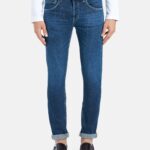 Jeans George cinque tasche skinny fit, vita bassa, taschino a filetto. Denim stretch responsabile blu 13 1/4 oz. Lavaggio scuro pulito gots. Logo Dondup. Made in Italy