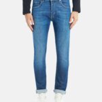 Jeans Icon cinque tasche regular fit, vita regolare. Denim stretch responsabile blu 11 1/2 oz. Lavaggio medio pulito gots. Logo Dondup. Made in Italy