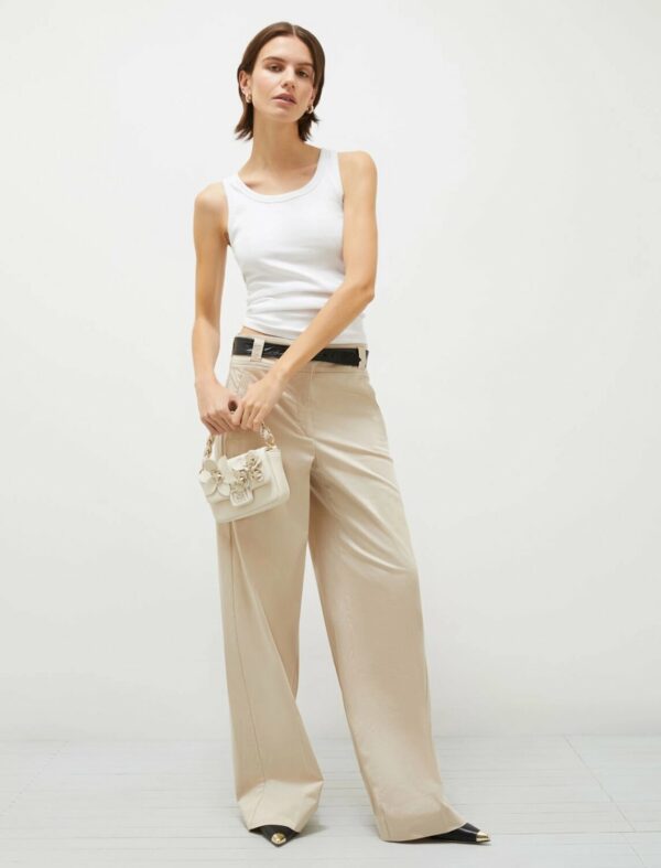 Informale ma cool, il pantalone in raso stretch gioca con il fit dritto sulla gamba e il dettaglio della cintura abbinata. Da completare con t-shirt, bijoux e sneaker per una uscita easy chic.