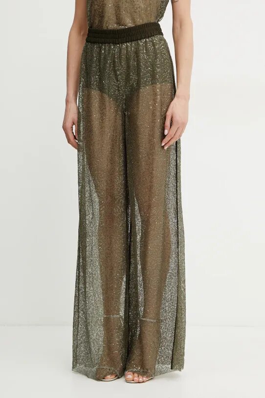 Pantaloni lunghi e ampi da sera in tessuto tecnico lavorato a rete decorata con paillettes in tono colore ricamate che formano un disegno particolare su tutto il capo. La trasparenza del tessuto di questi pantaloni palazzo è attenuata da coulotte in tessuto inserita sotto. Vita regular con elastico e punto smock che crea un motivo arricciato. Questi pantaloni rendono speciale ogni tuo passo, scintillando e rivelando la tua femminilità unica per eventi serali e feste.