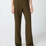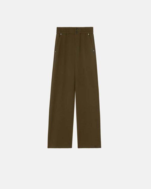 Pantaloni lunghi da donna realizzati in tessuto crêpe di viscosa stretch dalla mano particolarmente fluida. La vita alta è caratterizzata da elastico e motivo arricciato, completata da passanti per cintura. Gamba dalla linea dritta e leggermente ampia, con tasche alla francese sui fianchi. Chiusura con zip e doppio bottone in vita.