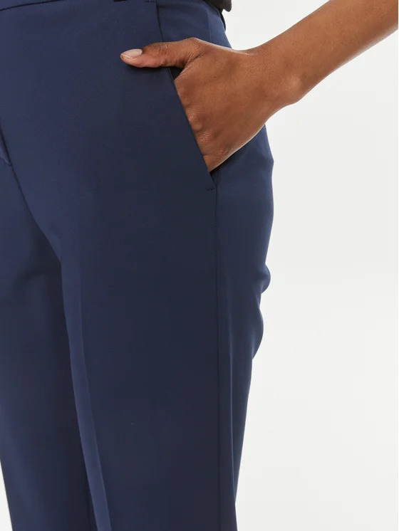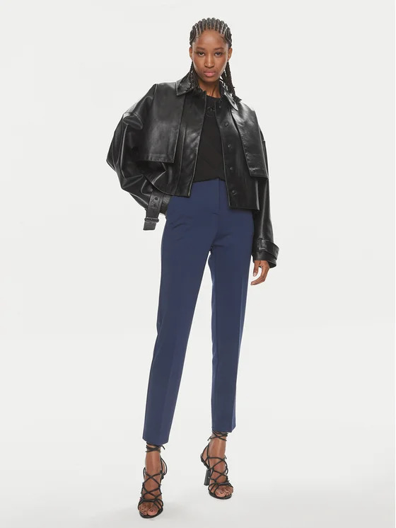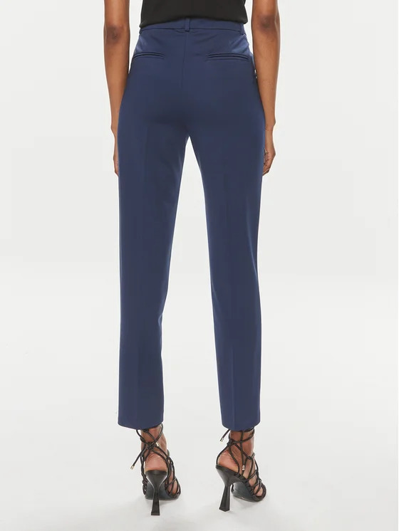 Pantaloni cigarette-fit in tessuto tecnico di viscosa stretch lavorato punto stoffa dal particolare effetto scuba. Dettaglio di piega stirata al centro gamba sia davanti che sul retro, tasche alla francese davanti e a filetto sul retro. Foderati. Vita con passanti per cintura, chiusura con zip e piccolo gancio.