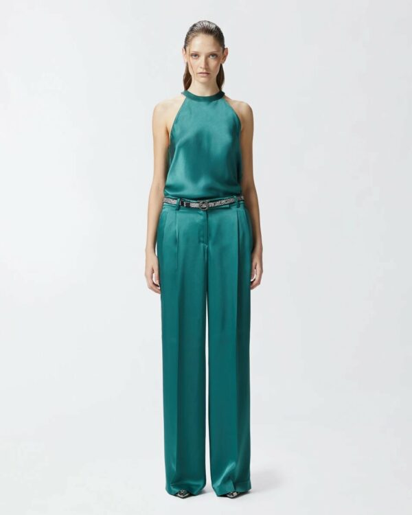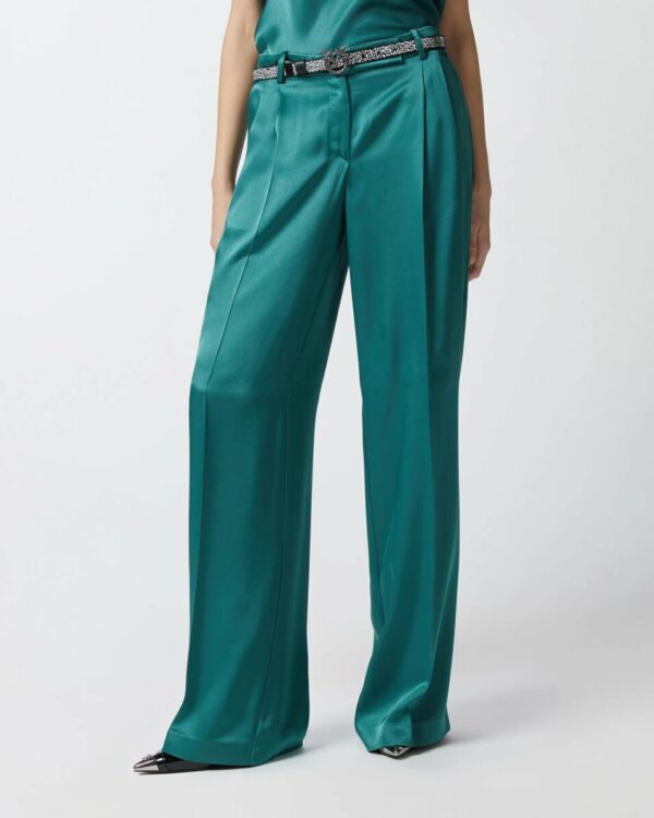 Pantaloni stile tailored in lucido tessuto satin. Vita regular con passanti per cintura e gamba dalla linea ampia e fluida, con tasche alla francese sui fianchi. Chiusura con zip e gancio coperto.