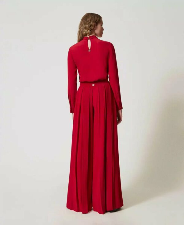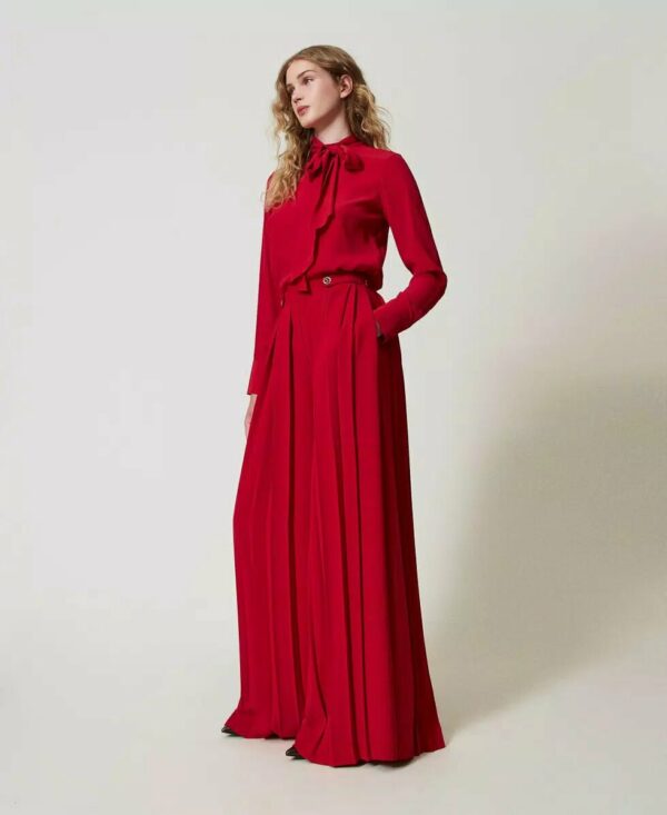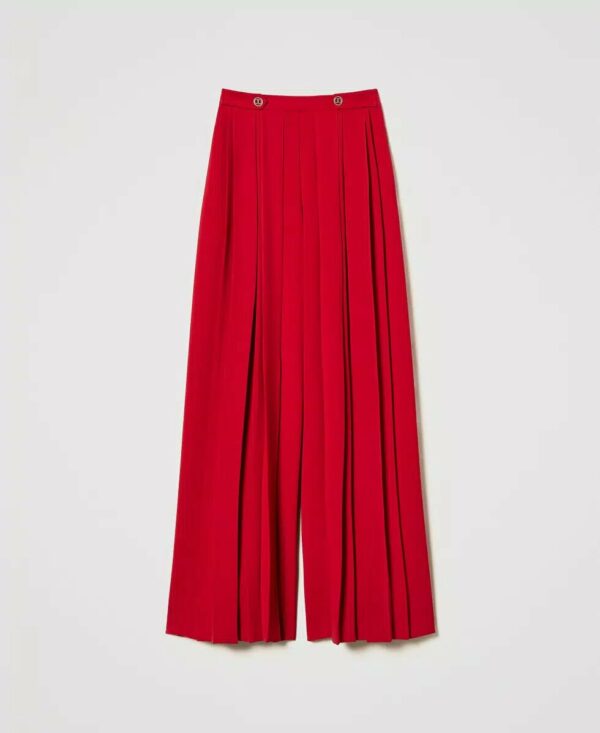 Pantaloni in crêpe con pieghe piatte sormontate e stirate a plissé fino al fondo. Ha chiusura con zip al fianco, linea wide leg. Questi pantaloni eleganti sono perfetti per un'occasione speciale.