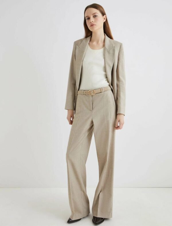 Da abbinare al blazer coordinato o da indossare con una maglia morbida, questo pantalone in lana e viscosa stretch ti accompagnerà nei tuoi look quotidiani. I piccoli dettagli maschili e le pince sul retro aggiungono originalità.