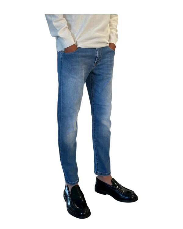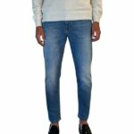 Jeans da uomo blu denim. Modello classico cinque tasche; chiusura con zip e bottone; patch Camouflage applicata sul retro. Capo eco-sostenibile, pensato e ideato nel rispetto dell'ambiente, utilizzando materiali di recupero.