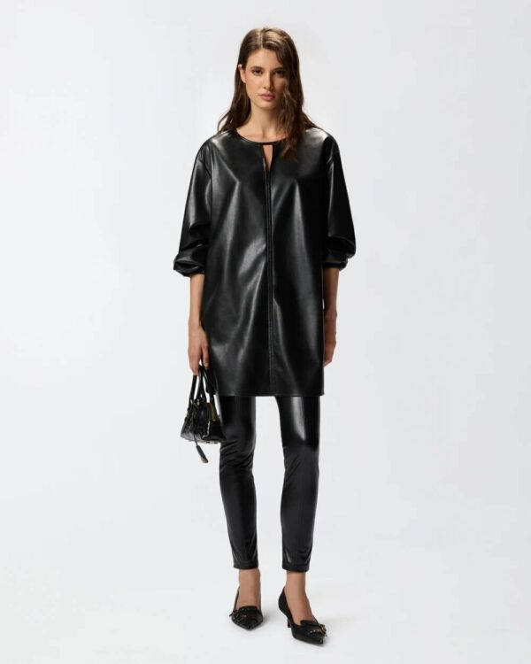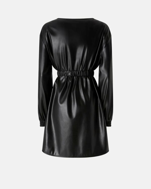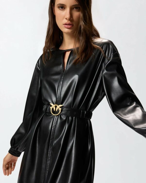 Abito corto con collo tondo definito da un'apertura a V sul davanti, e maniche lunghe morbide con spalla scesa e polsino elasticizzato. Il vestito è realizzato in un tessuto spalmato similpelle dalla mano morbida e dal look finale grintoso e contemporaneo. Il modello presenta una vestibilità sfiancata, più aderente sui fianchi. Completo di cintura abbinata nello stesso tessuto con fibbia Love Birds Diamond Cut in metallo.