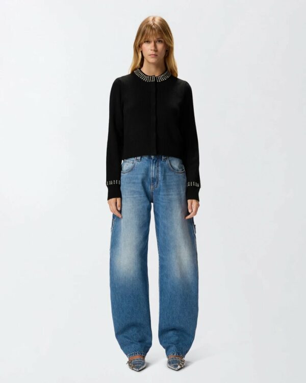 Cardigan girocollo a maniche lunghe proposto in un'elegante vestibilità slim. La chiusura del capo consiste in un'abbottonatura nascosta, mentre orlo e polsini donano movimento grazie a una lavorazione a coste. Sul davanti spiccano due tasche, una delle quali presenta l'iconica etichetta tono su tono con logo lettering PINKO. Il girocollo e i polsini catturano subito gli sguardi grazie alle applicazioni di strass che impreziosiscono il design: l'ideale per illuminare i tuoi look e le tue giornate. Il capo è stato sottoposto a prove di finissaggio per ridurre al minimo la possibile formazione di pilling, garantendo una maggiore morbidezza e durabilità del tessuto