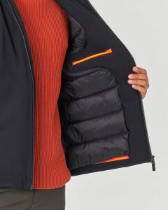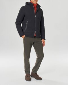 il design modernissimo e minimalista ha reso questa giacca invernale, calda e resistente agli agenti atmosferici, un autentico instant classic di successo della Collezione. La raffinata costruzione in tessuto a membrana Stratofabric#3, traspirante e impermeabile, presenta l'esterno nell'esclusivo SURFLEX® elasticizzato. Alla leggerezza e al comfort della vestibilità regolare si aggiunge la protezione dalla pioggia e dal vento fornita dal cappuccio fisso. L'isolamento termico è garantito dall'imbottitura in calda e leggera piuma d'anatra 90/10, contenuta nei canali tubici che prevengono la fuoriuscita di piume. Il contrasto della chiusura frontale e le zip termonastrate delle ampie tasche laterali aggiungono una nota distintiva sul look super opaco. L'interno è dotato del taschino chiuso da zip invisibile e ravvivato dal doppio filetto arancione fluo. La tag a cuore "Made with love, designed in Tuscany" e il logo a microiniezione nero sulla manica sinistra sono le note di stile inconfondibile di questo capospalla dal forte dinamismo urban.
