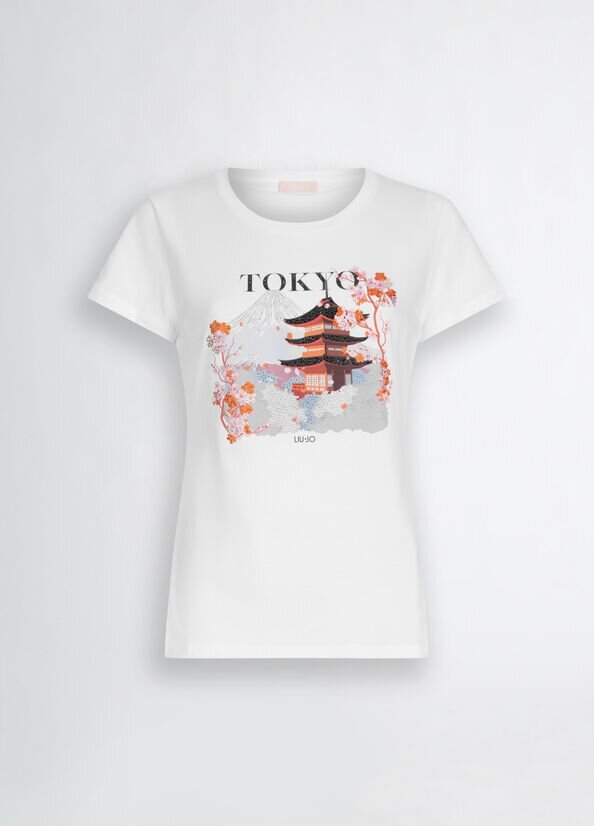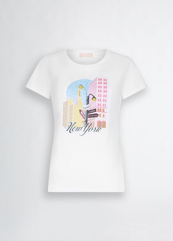 T- shirt in cotone con stampa e strass liu jo pe 25 art. wa5239