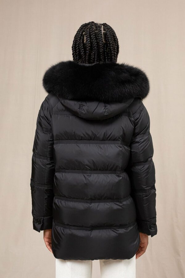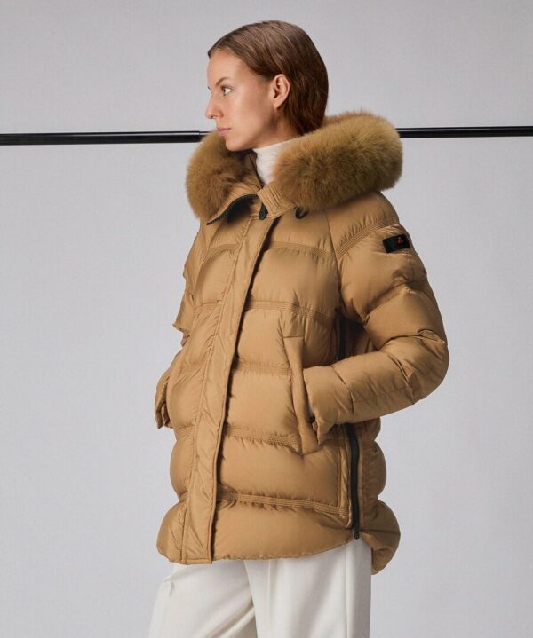 Puffer jacket ad ampie trapunte, in tessuto super-light in 100% poliestere riciclato da materiali post consumo, dalla mano morbida e dalla struttura super compatta. Limbottitura in piuma doca certificata assicura calore elevato e leggerezza, mentre il trattamento idrorepellente PFC Free protegge senza luso di sostanze chimiche nocive. Di gusto urban sportswear, la shape ad A è regolabile grazie allapertura delle zip laterali, mentre il cappuccio fisso è arricchito da un bordo in pelliccia di volpe staccabile in tono colore. Completano il modello le tasche a filetto, la chiusura con patta e bottoni che nasconde una zip a doppio cursore. Il modello, bestseller della collezione invernale di Peuterey, ora nei colori trend della stagione, può essere indossato anche in occasioni eleganti e mondane.