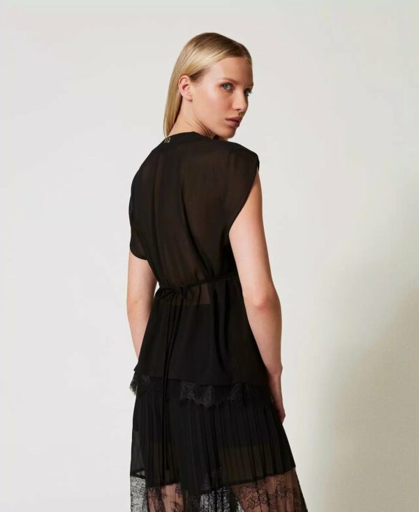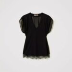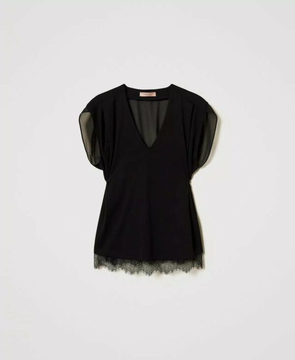 Top in jersey con retro in georgette e fondo in pizzo smerlato. Ha scollatura a V, dettaglio di pieghe davanti fermate da cintura in tessuto da annodare davanti o dietro, maniche corte ad aletta, placchetta logo Oval T sul retro, linea morbida.