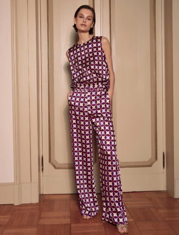Top in raso, linea leggermente svasata. Scollo rotondo, senza maniche. Chiusura a goccia con bottone ricoperto sul retro.