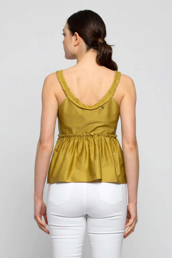 Top svasato in tessuto 100% cotone caratterizzato da spalline e scollatura sul retro intrecciate. Una balza applicata dona movimento al capo e una vestibilità ampia e comoda. Indossalo con un paio di pantaloni eleganti per un look chic e ricercato.