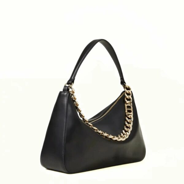 Borsa hobo 'Liliane' di TWINSET made in Italy, realizzata in pelle di vitello liscio pieno fiore con trattamento anti goccia e antigraffio. Il corpo è realizzato a colonna, con logo impresso a caldo, e foderato con un twill in misto cotone. Ha due manici staccabili, da indossare simultaneamente o separati per diverse interpretazioni di styling: uno in pelle sagomato e imbottito, l'altro è una catena in lega leggera in galvanica oro con l'Oval T inserito tra le maglie.
