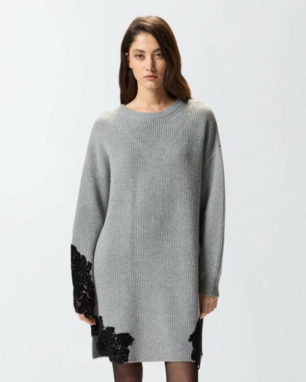 Abito corto in maglia di misto lana lavorata a costa inglese: un filato che offre un equilibrio perfetto tra comfort e morbidezza. Il dettaglio che impreziosisce il design è lintarsio realizzato a mano con pizzo floccato su una manica e sull'orlo. Il capo è stato sottoposto a prove di finissaggio per ridurre al minimo la possibile formazione di pilling, garantendo una maggiore morbidezza e durabilità del tessuto. Il tocco finale è dato dall'etichetta tono su tono con logo lettering PINKO dietro al collo. Aggiungi questo design al guardaroba per donare un twist ai tuoi outfit invernali.