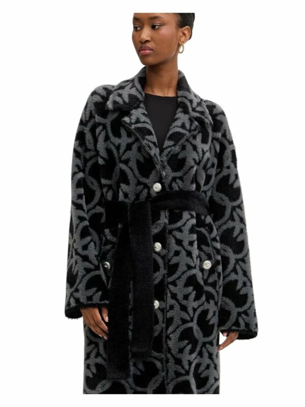 Cappotto donna PINKO grigio e nero realizzato in morbido tessuto effetto pelliccia con iconica fantasia logo jacquard intrecciato. Elegante e avvolgente, presenta revers ampi, chiusura frontale con bottoni gioiello e cintura coordinata che sottolinea la vita e valorizza la silhouette femminile. Le tasche laterali applicate aggiungono praticità e stile. Perfetto per la stagione autunno inverno, unisce comfort e raffinatezza in pieno stile PINKO.